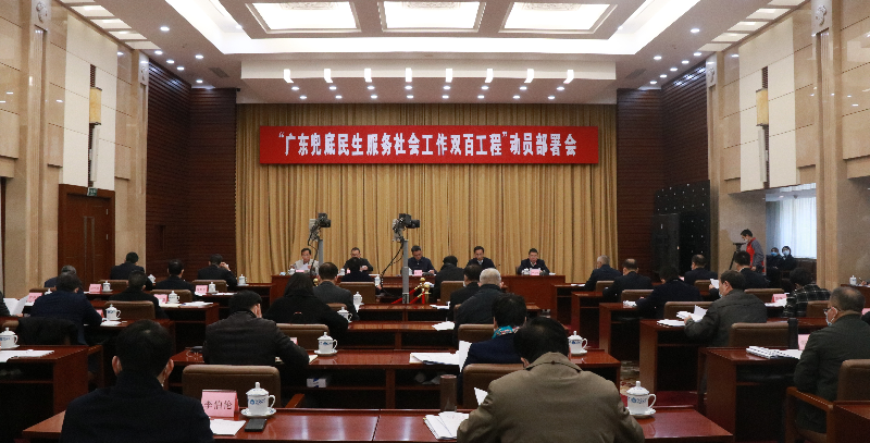 1月12日,“广东兜底民生服务社会工作双百工程”动员部署会在广州召开,会议深入贯彻落实习近平总书记关于民生民政工作和广东工作系列重要指示精神,解读“广东兜底民生服务社会工作双百工程”(以下简称“双百工程”)实施方案,部署推动“双百工程”组织实施工作,确保“双百工程”谋好篇、开好局、起好步。省政府领导,民政部慈善社工司领导出席会议。